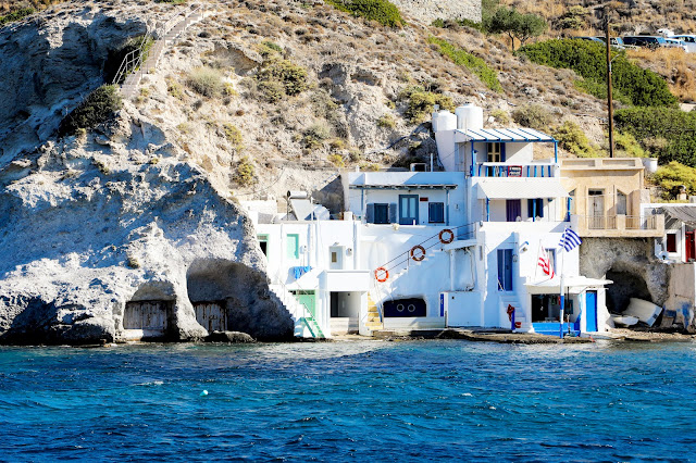 繼續前進,下一站是我昨日到訪過的小漁村 Klima,從海上看過去,只能遠觀,景色當然不及親身走一轉。至於為何 Klima 的每一間船屋大門都髹上了不同的顏色?船長就給出了他的答案,就是讓飲醉酒的漁夫也不用擔心認錯屋企......,令人無語。