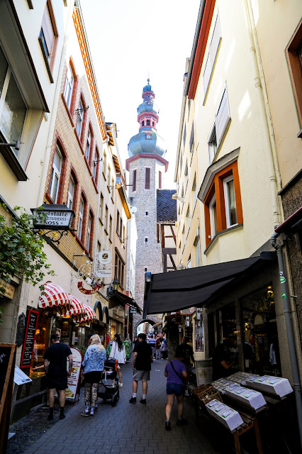 遠看過 Reichsburg,我們就正式進入舊城區 Altstadt,明顯感覺到街道較為狹窄,而且兩邊盡是餐廳和店舖,當中最常見到的商品就是 Cochem 的特產 riesling 白葡萄酒,可惜我們今次回程時沒有購買寄艙行李,否則肯定會捧着幾支離開。